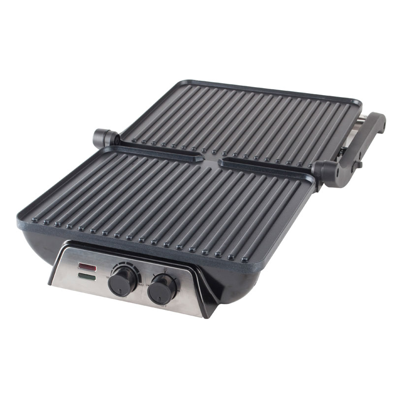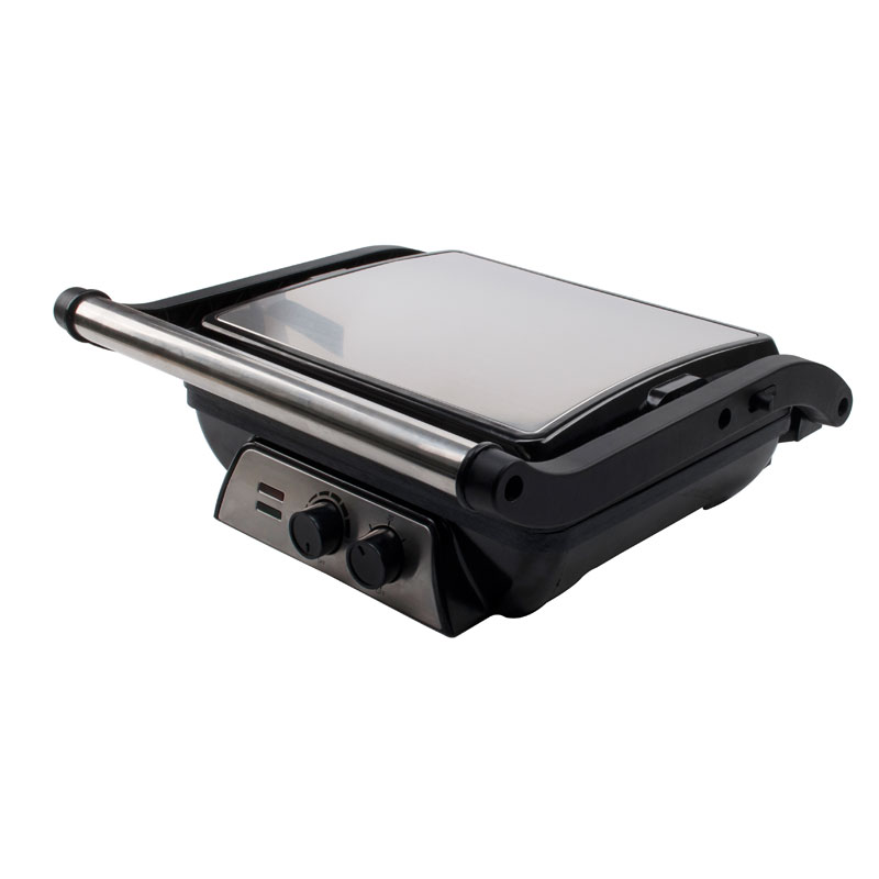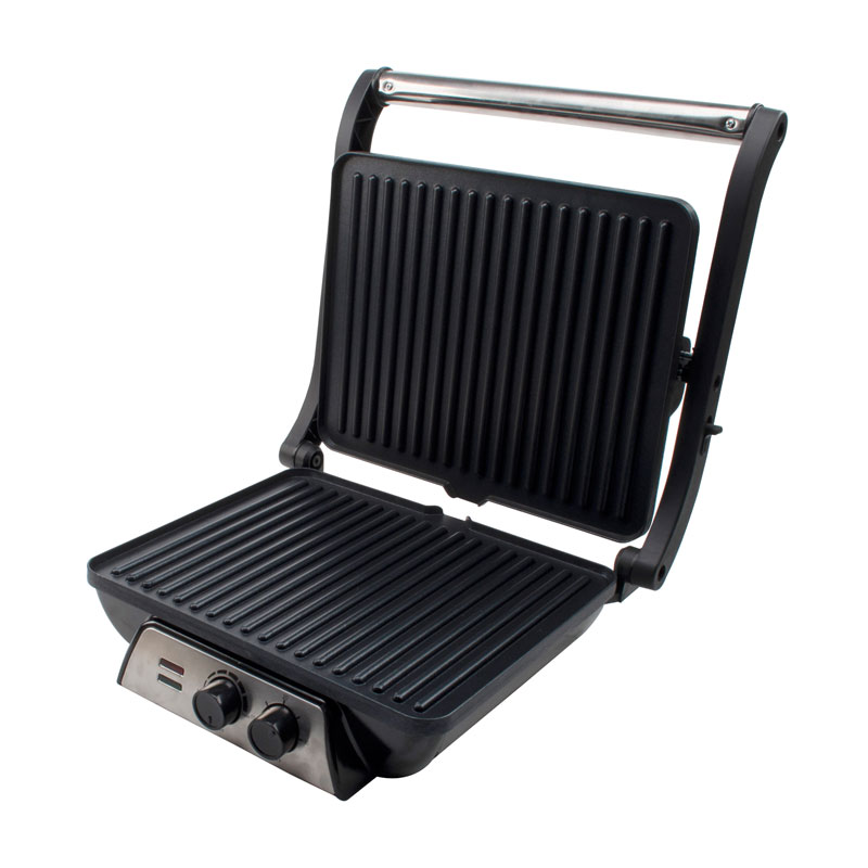 | Ciri-ciri Utama | Pemegang selamat sentuh sejuk, Dulang titisan untuk mengumpul minyak berlebihan, Tombol kawalan suhu boleh laras, Salutan tidak melekat untuk pembersihan mudah, Sistem engsel terapung (melaraskan secara automatik kepada mana-mana saiz pembakar roti, daging atau snek), Mod gril terbuka 180°C, Hidupkan & lampu sedia, Kaki kalis gelincir |